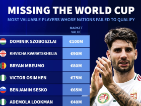 无缘世界杯球员身价榜:索博1亿欧居首,KK7次席、姆伯莫第三