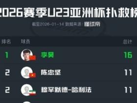 化身叹息之墙!U23亚洲杯小组赛扑救榜:李昊16次大幅领先
