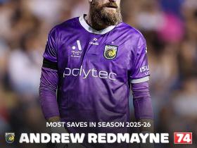 澳超本赛季扑救排行榜:中央海岸水手门将瑞德迈恩74次领跑