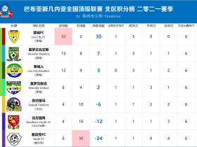 终于把打到现在前六轮的巴新顶级联赛积分榜整完了。...
