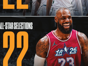 詹姆斯生涯第22次入选全明星,与东部首发五人入选次数之和相同
