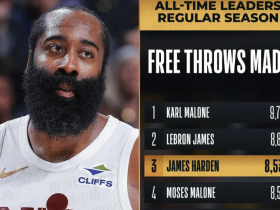超越摩西-马龙,哈登生涯罚球命中总数达8532个升至历史第三
