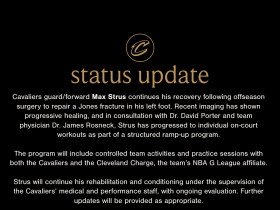骑士官方:斯特鲁斯恢复情况良好,接下来将逐步开启有球训练