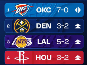 NBA第三周战力榜:雷霆7胜0败继续排名第1,掘金第2,湖人第3