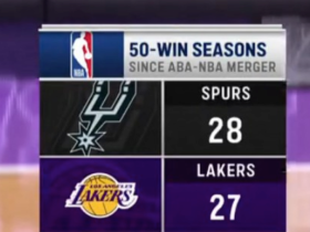 自76年ABA和NBA合并以来赛季50胜:马刺28次第1,湖人27次第二