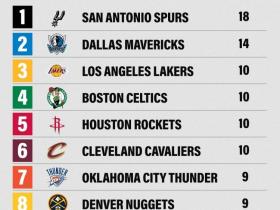 新世纪后50胜赛季数:马刺18次领跑,独行侠第2,湖绿火骑第3