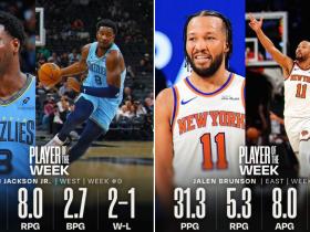 官方:布伦森和小贾伦-杰克逊分别当选上周NBA东西部最佳球员